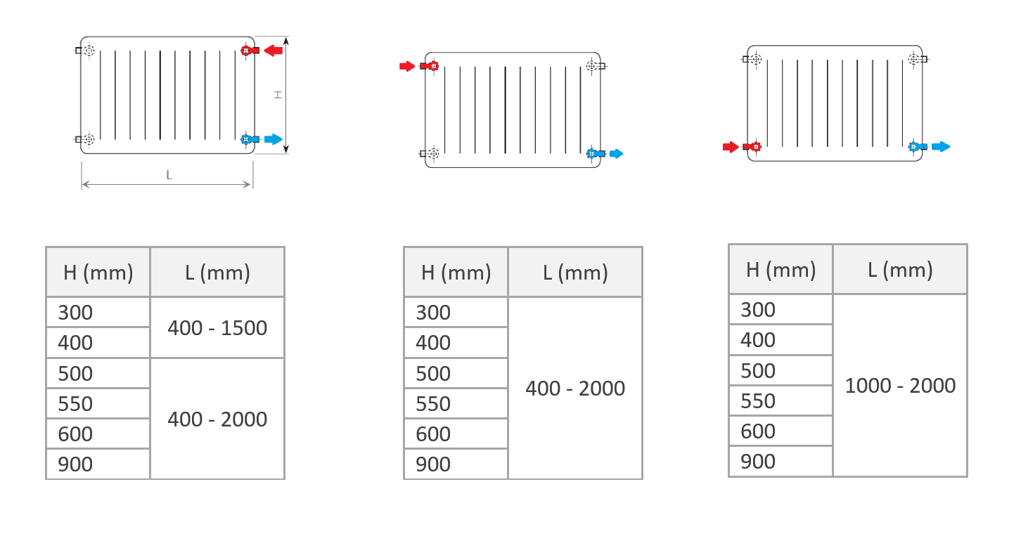 - Základné rozmery Výšky H 300, 400, 500, 550, 600, 900 mm Dĺžky L 400 až 2000 mm, s krokom 100mm Pripojovací rozstup h = H -54mm Pripojovací závit 4 x G 1/2″ vnútorný
