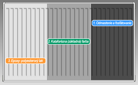 Dvojvrstvové anoforetické farbenie radiátorov bolo zavedené v roku 1990 zakúpením automatickej farbiacej linky EISENMANN, ktorá bola v roku 2002 modernizovaná na kataforetický systém nanášania základnej farby.