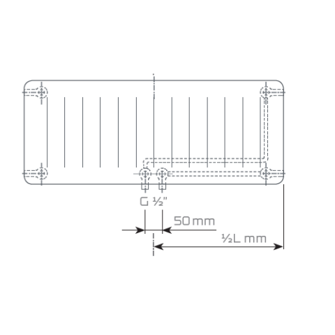 - Základné rozmery Výšky H 300, 400, 500, 600, 900 mm Dĺžky L 400 až 2000 mm, s krokom 100mm Pripojovací rozstup h = 50mm Pripojovací závit 6 x G 1/2″ vnútorný