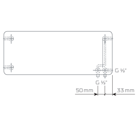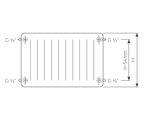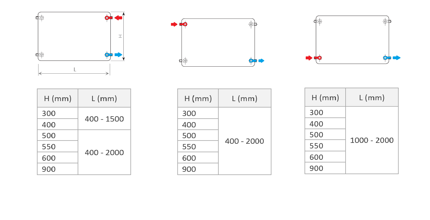- Základné rozmery Výšky H 300, 400, 500, 550, 600, 900 mm Dĺžky L 400 až 2000 mm, s krokom 100 mm Pripojovací rozstup h = H -54 mm Pripojovací závit 4 x G 1/2″ vnútorný